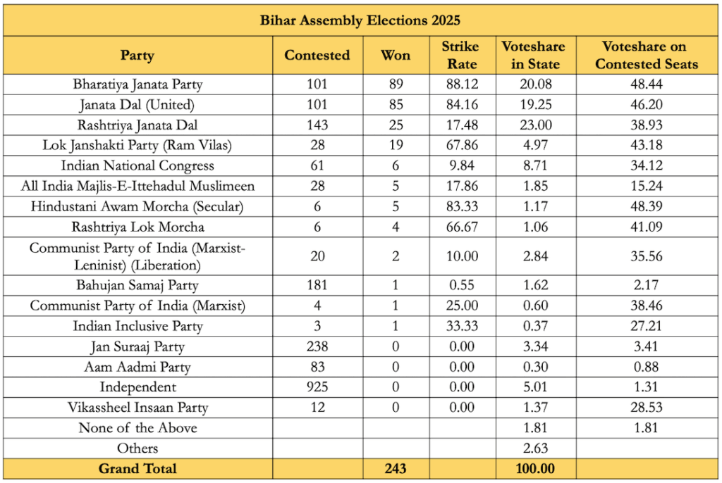 The post election press conference by JSP leaders also highlights that people transferred their votes from JSP to NDA as they wanted to avoid a ‘Jungle Raaj’ under RJD again. This explanation only reflects the inability to address the coordination problem beforehand, and even deepening it further by Prashant Kishor’s decision of not contesting in the election.