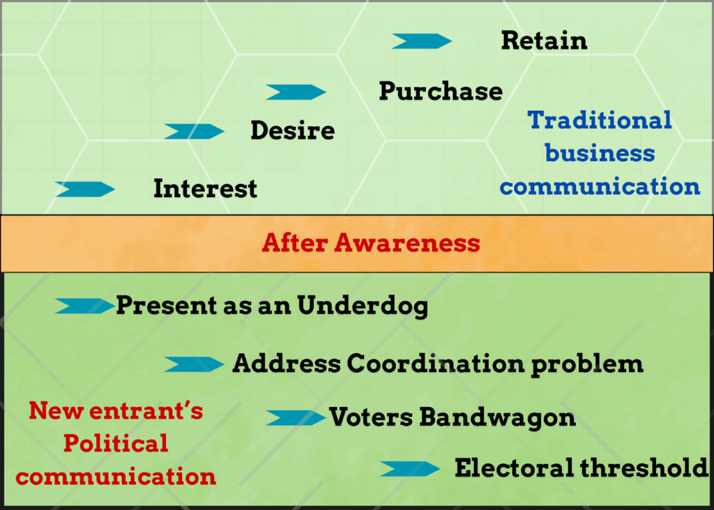 For example, if credible surveys suggest that 15% of voters see you as a popular CM face, the next step is to ensure that a good part of these 15% actually vote for you. This can be achieved by addressing the coordination problem in these 15% voters by providing stronger reasons for them to vote for you. The next step is to convert/direct these 15% supporters towards becoming 25% supporters by creating a bandwagon effect through publishing surveys, increasing the communication reach of your messaging, testimonials, etc. Once there is a reasonable share of voters seriously considering voting for you, alliances in the final stages can help you cross the electoral thresholds you require to capture power.