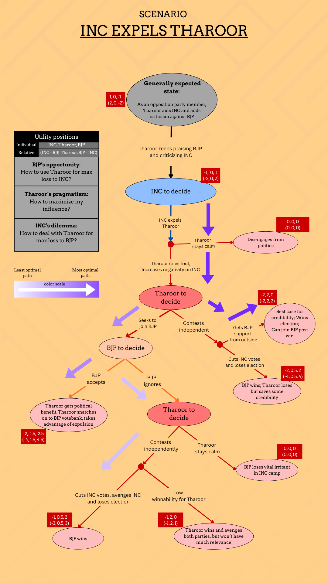 Since there are many sequences of decisions possible, current state where Tharoor praises BJP and criticises INC is modelled as the baseline. Decision of these players: INC, Tharoor and BJP can enhance or reduce one’s posture vis-a-vis others. Since benefit of a party can mean deficiency for the other, relative gain/loss are considered in finding the optimal path in which decisions could take.